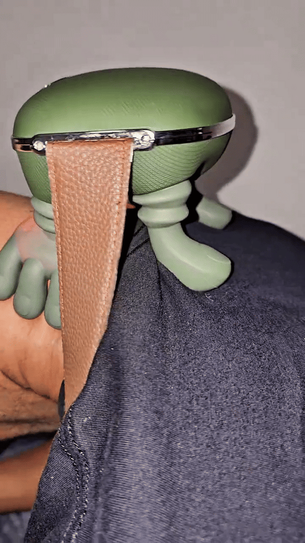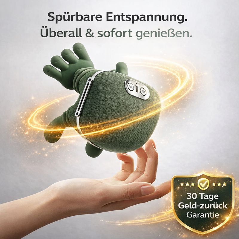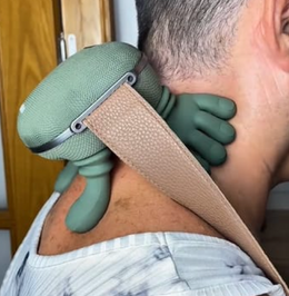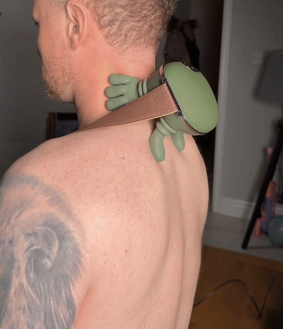 Die oberen acht „Finger“ kneten den Nacken, während der untere „Daumen“ den Trapezmuskel hebt und gezielt drückt. - Löst verspannte Muskeln